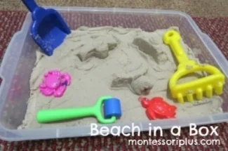 Simply use a large, low plastic box with a lid and place sand in it. Go to the dollar store and purchase some simple sandbox toys. Place the box on a table or on the floor. At our school we took a plastic wading pool and filled it with sand in our multi-purpose room, but at home, we made a small one from a plastic container. I have used plastic letters and allowed the children to “write” words in the sand for a more meaningful learning experience. Another favorite activity with our sandbox was to purchase cheap “gold coins” from a party store and then bury them. Allow a few children to “dig” up the coins and then count their “treasure!” This indoor sandbox will always be a busy area!