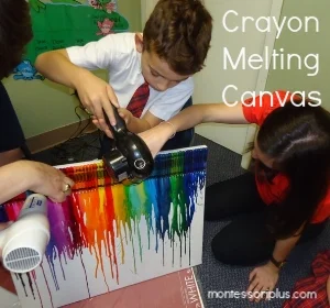 This last activity was shown to me by a parent, and the children loved it so much that I do it every year! In this activity the students will work together to create a beautiful wall hanging for the classroom or a child’s room. Take a blank white canvas and glue a box of crayons across the top. Allow them to dry overnight. Then stand the canvas up over a plastic trash bag. (This is to keep the melting crayons from melting on the flooring!) Allow the children to take turns using a hair dryer and directing the air flow over the crayons. In just a while stand back and watch the magic of how wax melts! This is a simple and fun project and one that looks very professional!